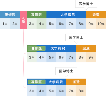 短期間に集中して専門領域の研究に専念し、できるだけ早く学位を取得したい方には、大学院への進学が可能です。特に、大学病院でなければできない臨床研究 テーマをもつ先生たちは大学院を選択することが多いです。大学院入学の時期は後期研修医(専修医)終了時が一般的ですが、前期研修中に大学院へ進学する コースや(社会人大学院)、専修研修コースの途中(卒業3年)でも大学院に入学可能です。前述の専門研修コースの派遣病院出向後に大学院に進学する医師も います。