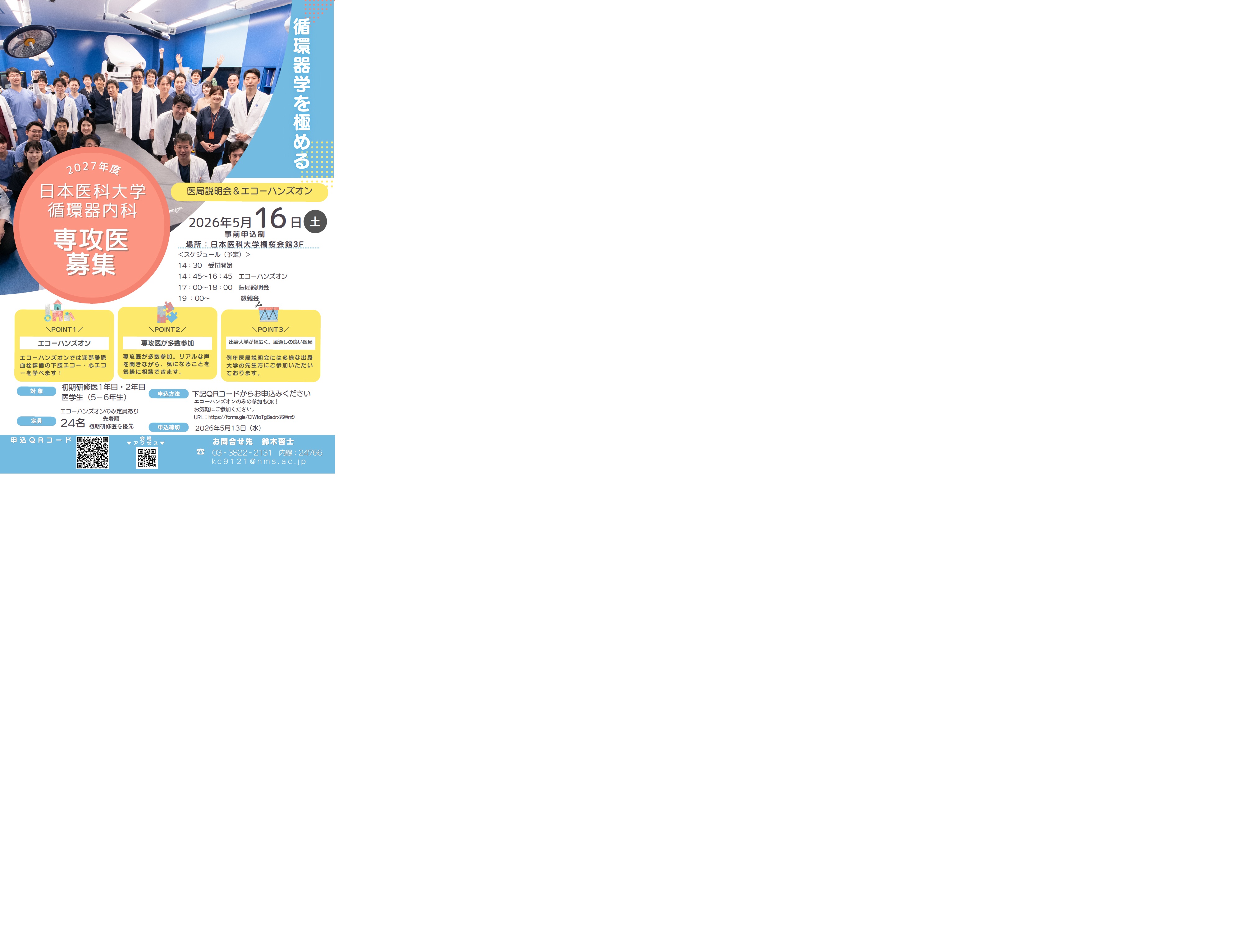 【New】2026年5月16日(土)エコーハンズオン・医局説明会を行います|日本医科大学循環器内科